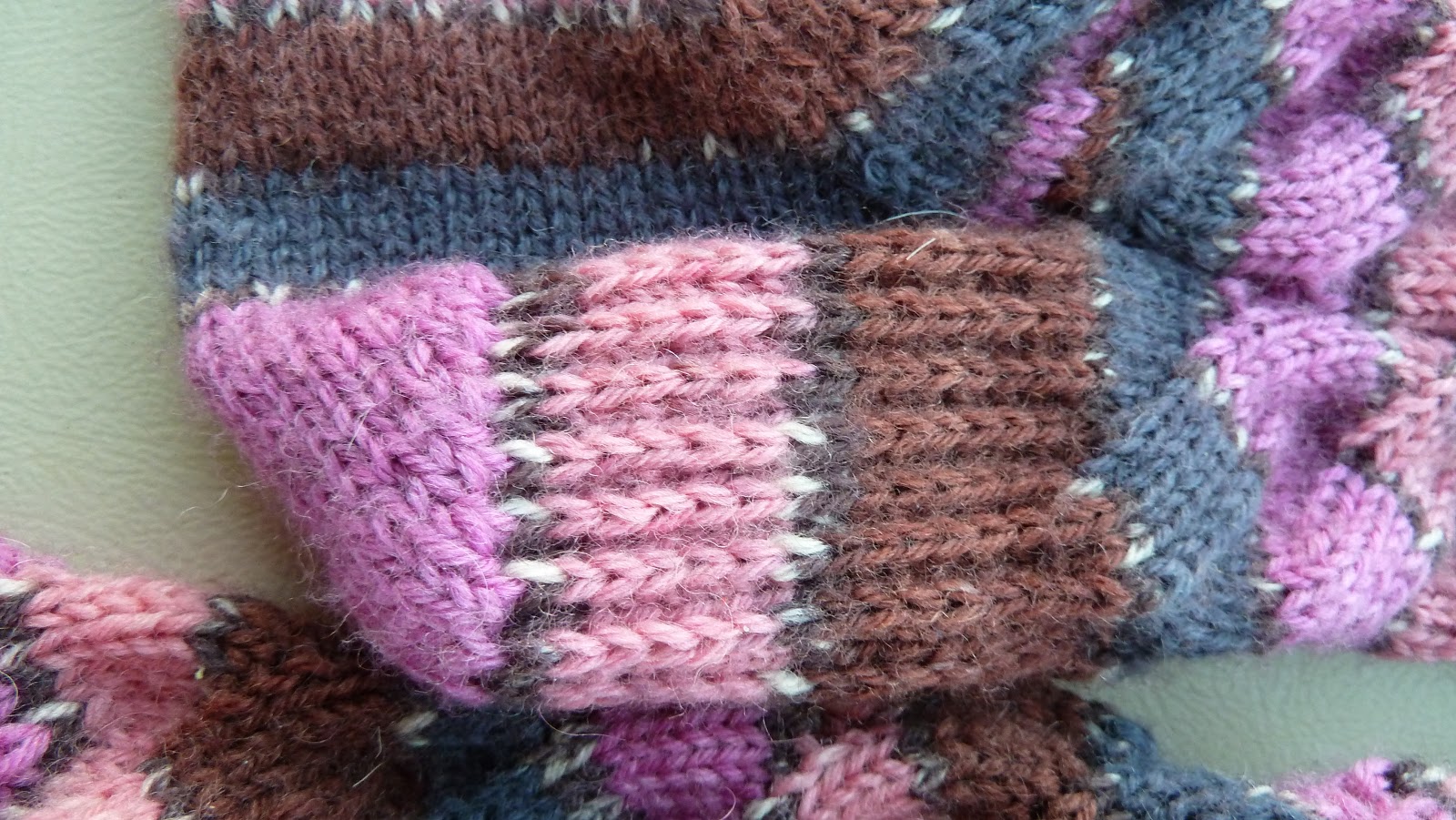 Since Christmas I have completed another pair of socks from ‘Kroy’ wool, this time using several patterns to get what I wanted. Last year I knit a pair of socks from the same pattern for a gift and used the short heel shaping. I discovered that, for my foot, this heel shaping just didn’t provide enough ‘depth’ for my high arch as the shaping doesn’t have a lot of give to it. However I loved the mock cable design in the pattern – the Nutkin Sock on www.Knitzi.com.
